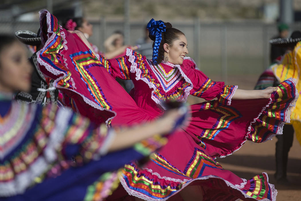 Naahi Ramirez, middle, a dancer with Federación de Poblanos en Las Vegas performs during a Cinco de Mayo festival at Shadow Rock Park on Friday, May 3, 2019, in Las Vegas. (Benjamin Hager/Las Vegas ...